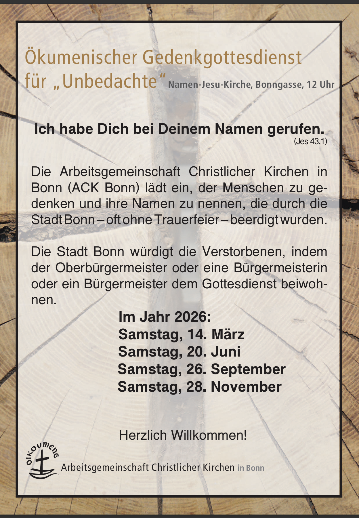 Die Arbeitsgemeinschaft Christlicher Kirchen in Bonn (ACK Bonn) lädt ein, der Menschen zu gedenken und ihre Namen zu nennen, die durch die Stadt Bonn – oft ohne Trauerfeier – beerdigt wurden. Die Stadt Bonn würdigt die Verstorbenen, indem die Oberbürgermeisterin oder eine der drei Bürgermeisterinnen dem Gottesdienst beiwohnen.
